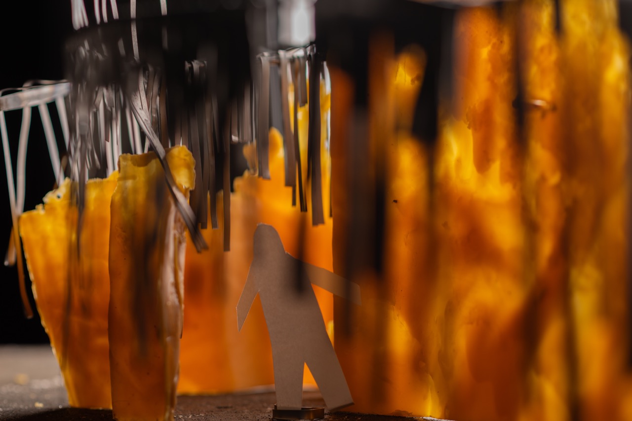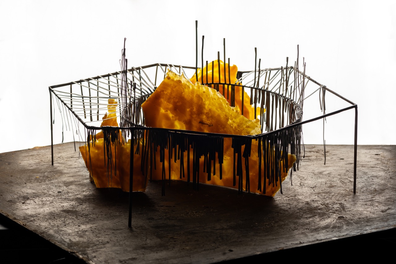 The division of the space happens from the inside out, through the three walls out of beeswax, with a property of softening up with heat, potentially allowing parts of the walls to bend, allowing for the wall to be transformed.