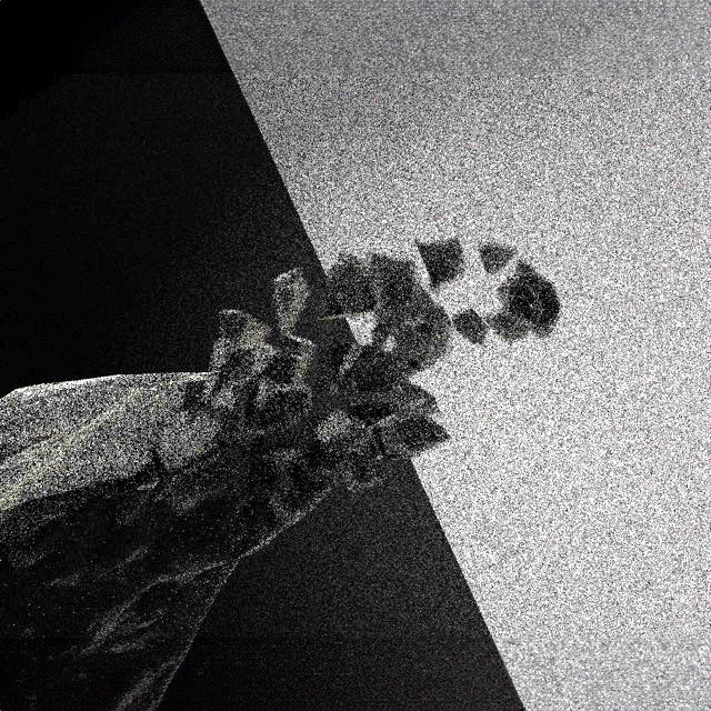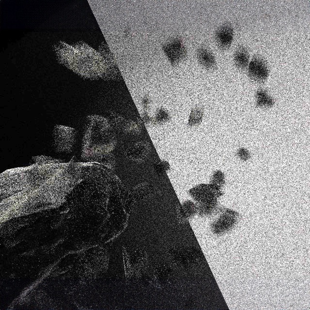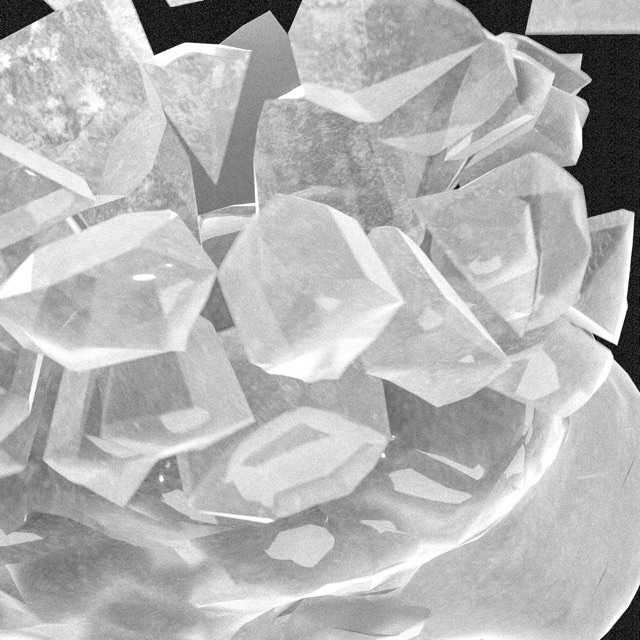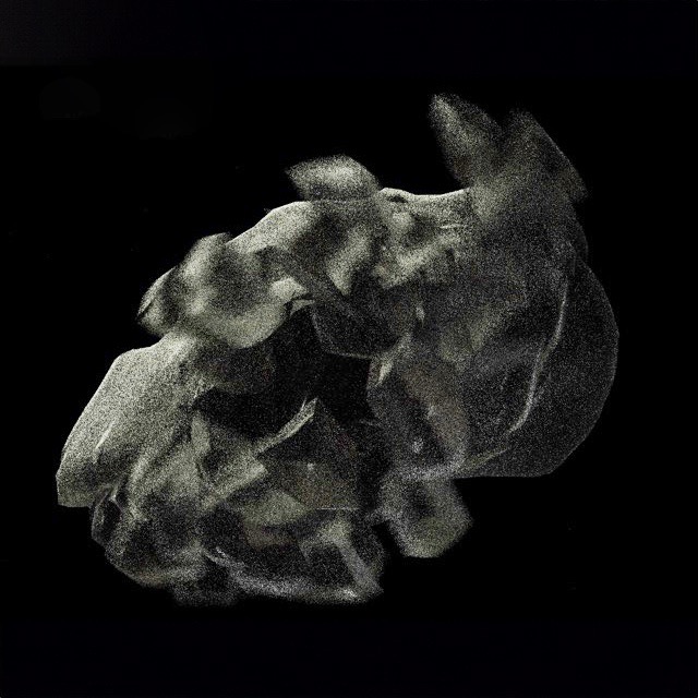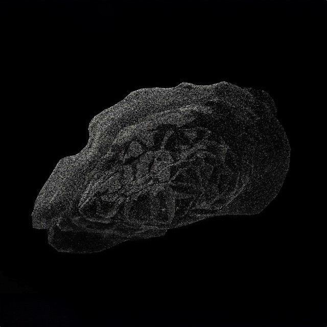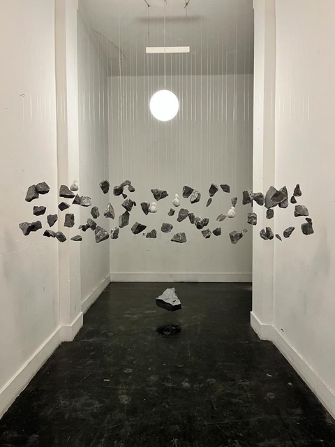 A stone exploded in 128 separate pieces hung in front of its 3d printed copy.